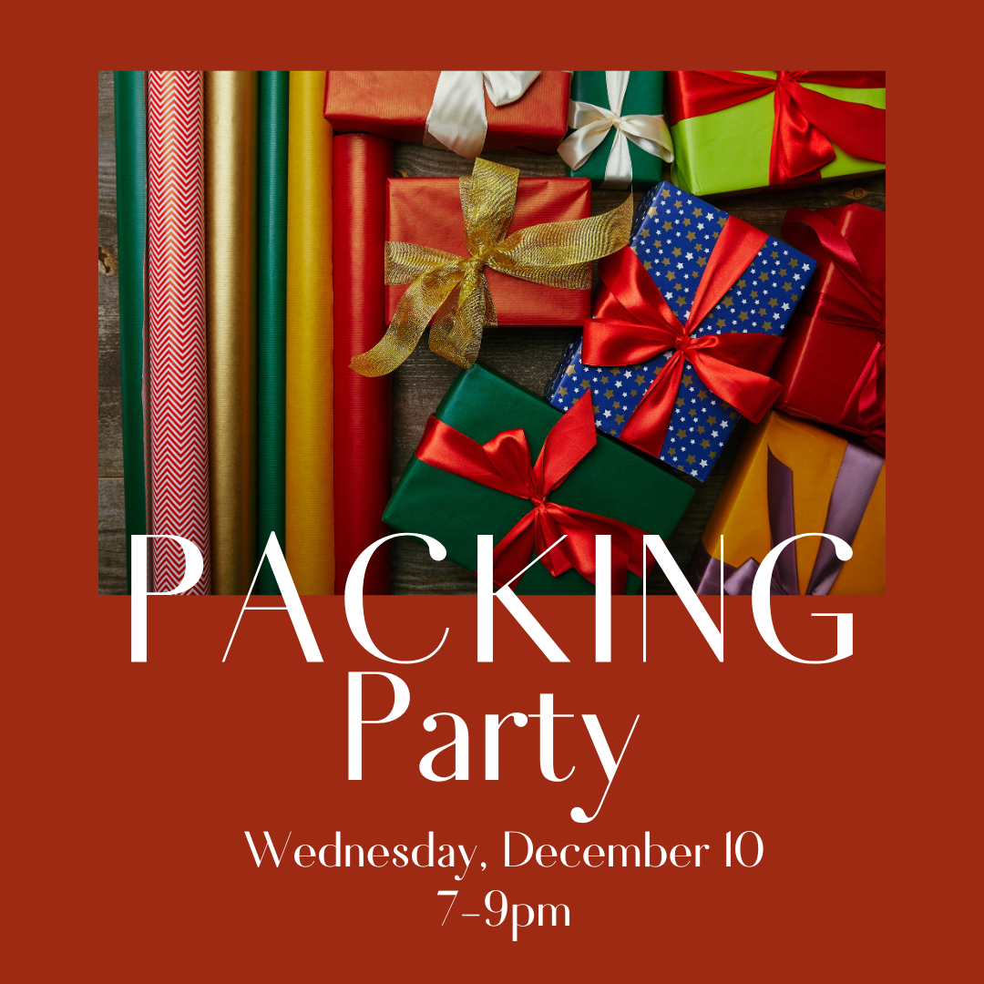 Wednesday December 10 from 7-9pm, for anyone who loves Christmas music, yummy treats, and fun people 😉 We'll be putting our hands to work prepping, packing and sorting!